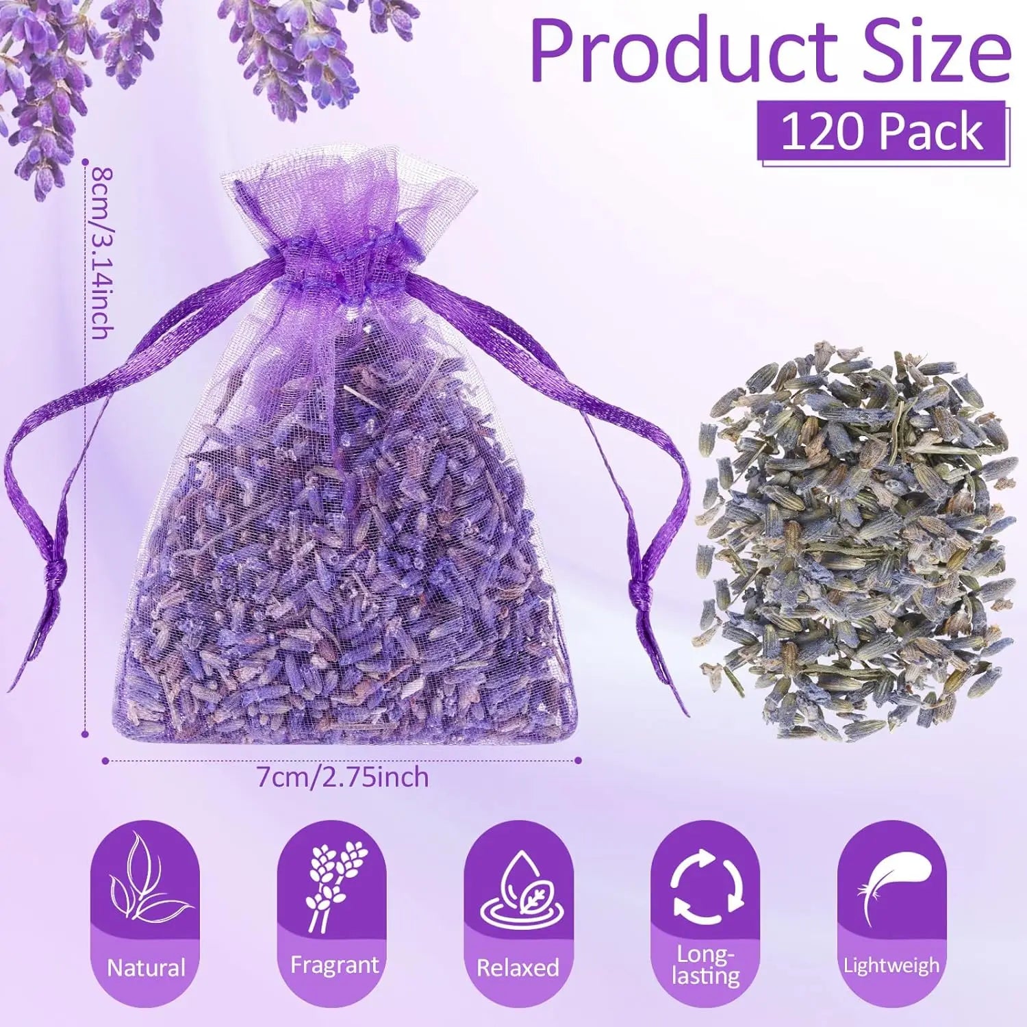 Sufficient Quantity: you will get 120 packs of lavender sachets, packaged in a sturdy and easily resealable bag, sufficient quantity can satisfy your multi purposes, and you can try to crush the flower buds a little with your fingers to refresh the fragrance of lavender