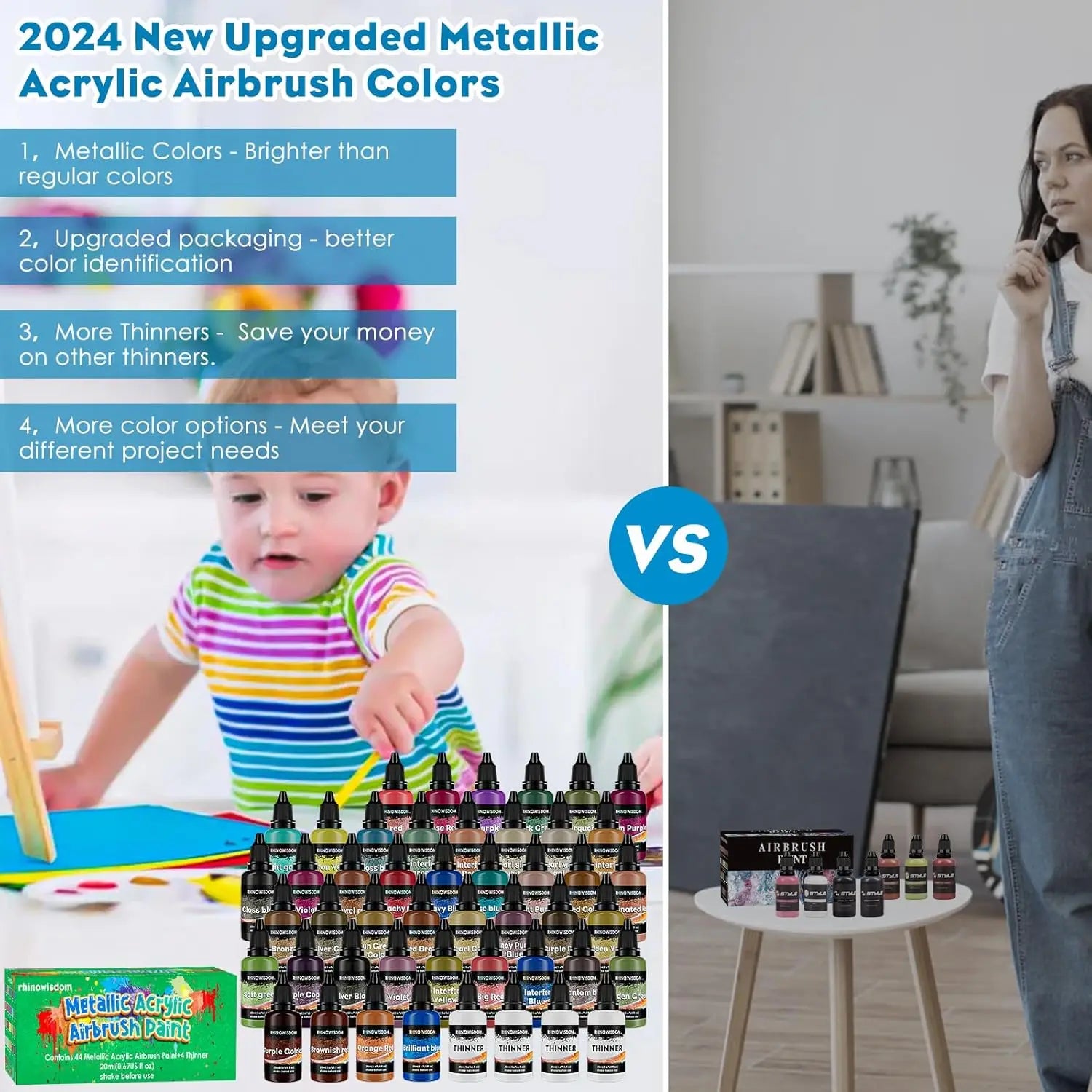 2024 New Metallic Acrylic Airbrush Paint Set - Air brush paint contains 44 metallic colors with 4 airbrush thinner. A variety of water based spray paint will meet most of your painting needs without mixing process. Each bottle is 20 ml/0.67 fl.oz