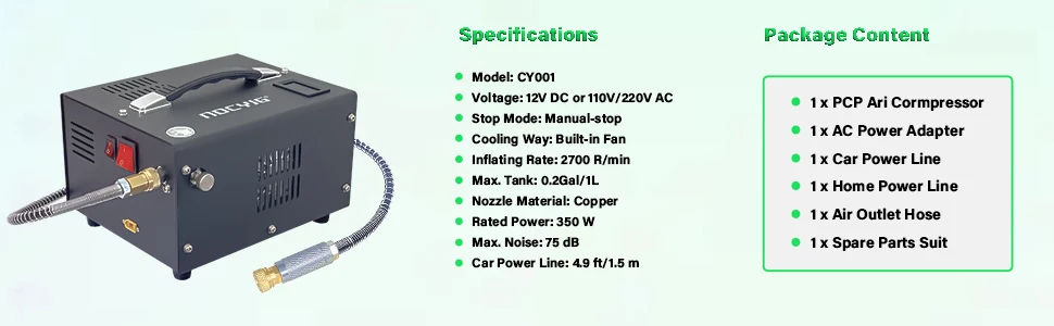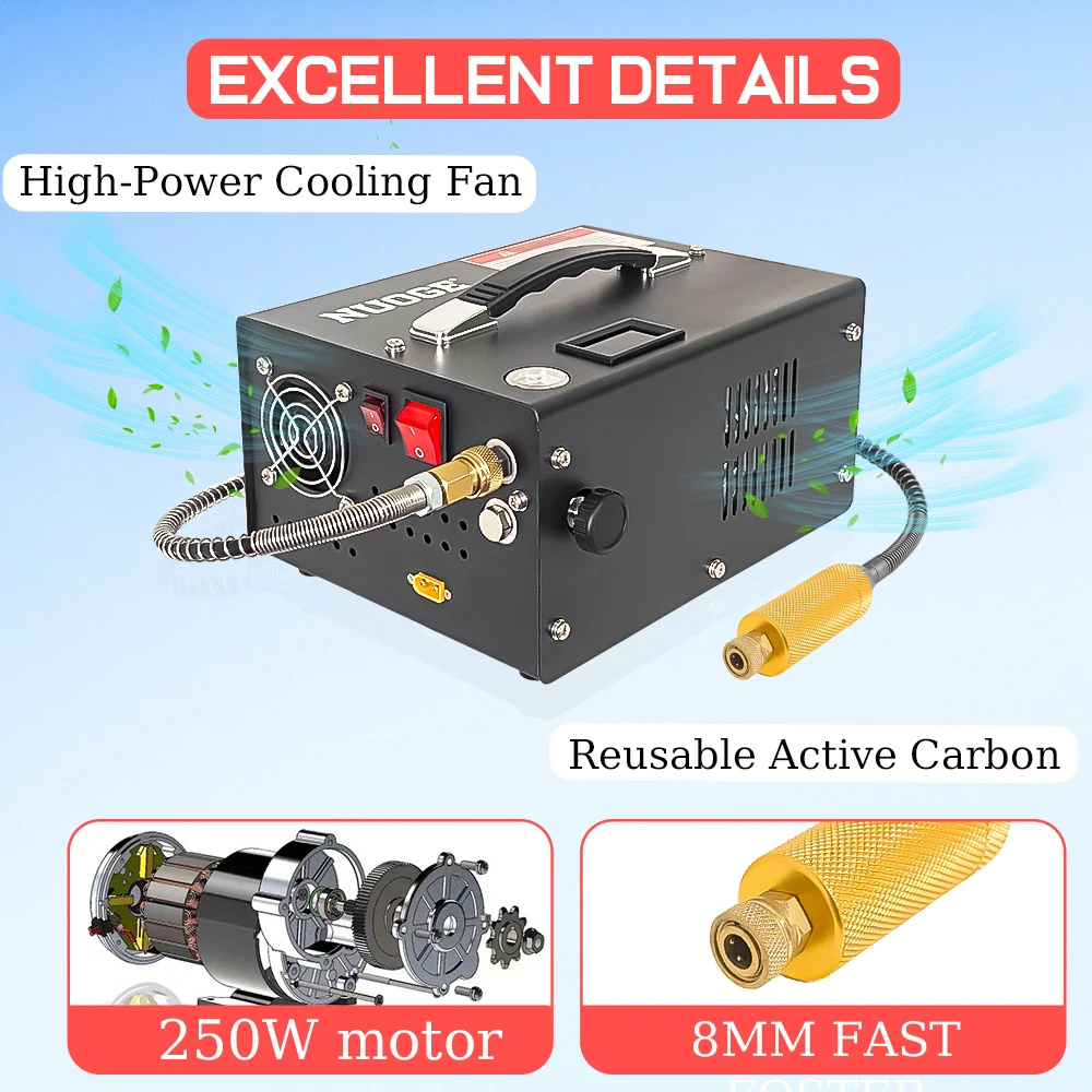 The PCP air gun compressor is cooled by a built-in fan and adopts a reusable carbon