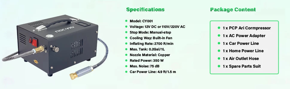 110V/220V AC socket can power this PCP air compressor at home with an external converter.