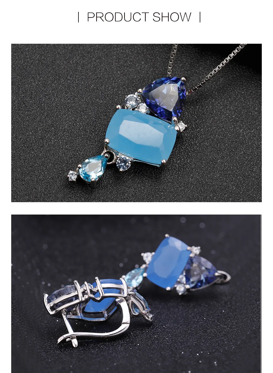 GEM'S BALLET Natural Aqua-blue Calcedony Candy Fine Jewelry 925 Sterling Silver Ring Earrings Pendant Jewelry Sets For Women