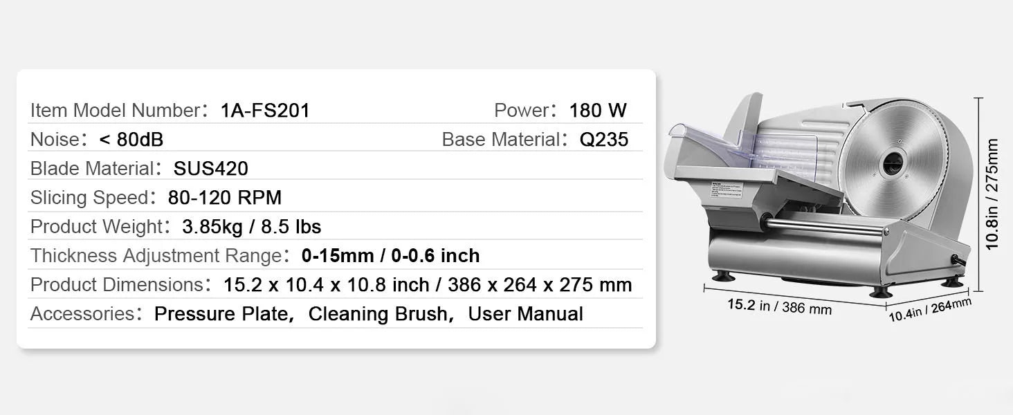 Upgraded SUS420 Blade: Our meat slicer is equipped with an upgraded 7.5" wide SUS420 stainless steel blade, effortlessly handling various food textures such as frozen meat, cheese, raw meat, cooked meat, ham, and bread.