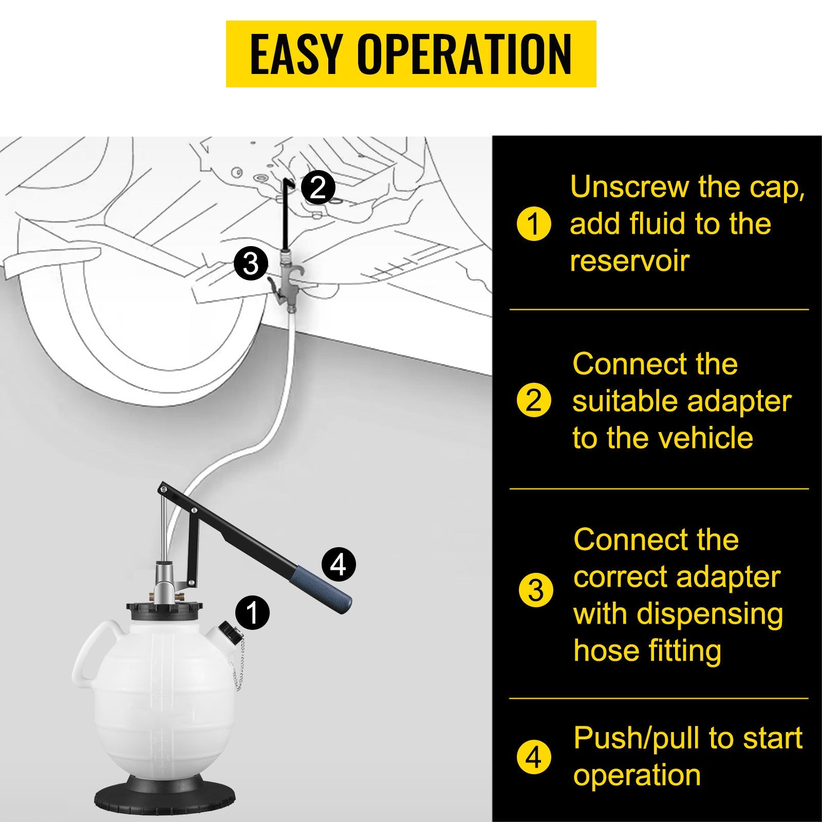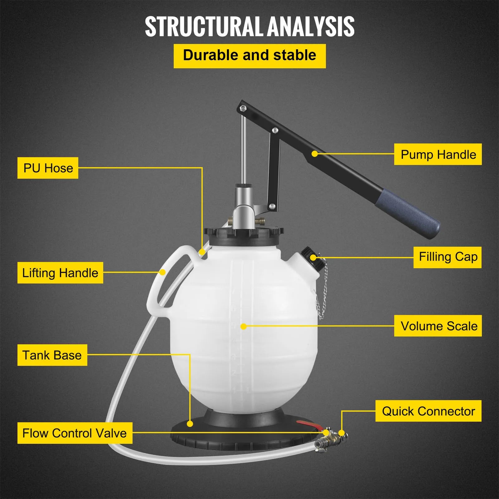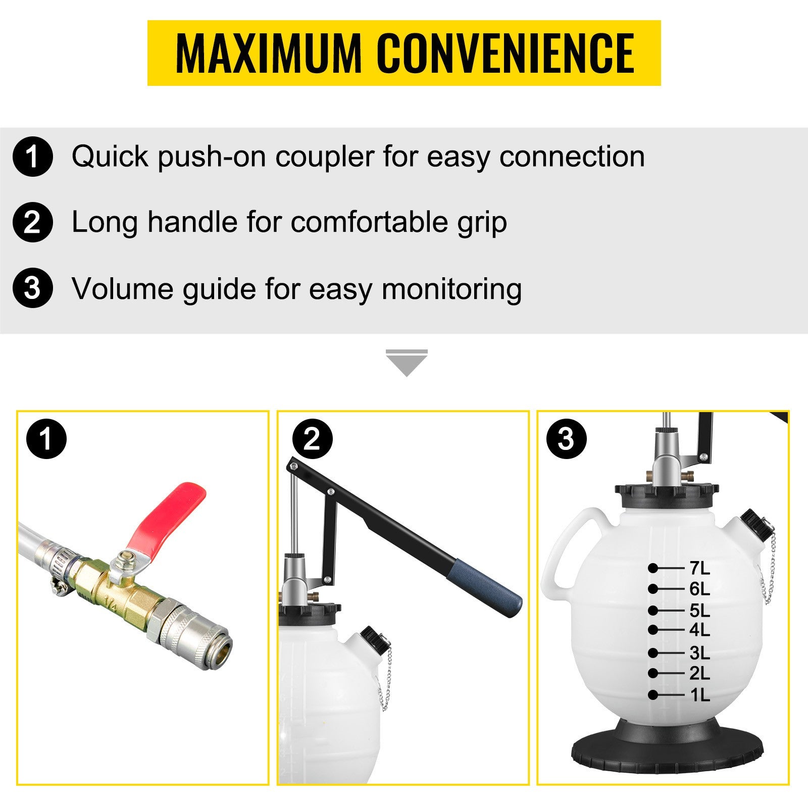 User-Friendly Features: Equipped with a clear volume scale for easy fluid level monitoring, a quick coupler for swift vehicle connection, and a comfortable long handle for ergonomic operation.