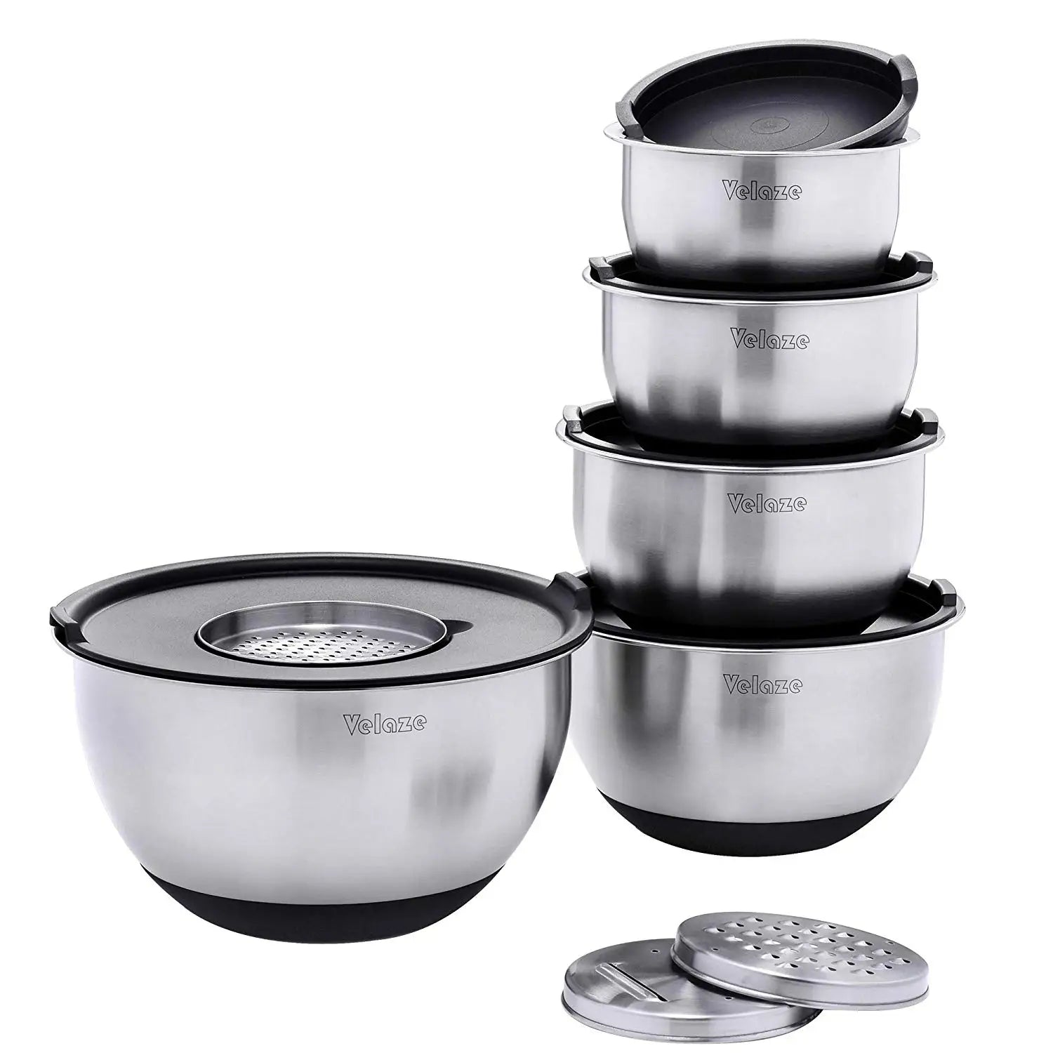 Velaze Set of 5 Stainless Steel Non Slip Salad Mixing Bowls with Grater and Lids for Baking Making and Storage 1L 1.5L 2L 3L 5L